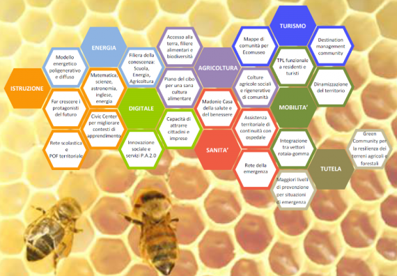 finalizzate a rafforzare le capacità di resilienza e di sviluppo del sistema territoriale come “green community” . Con un approccio olistico, integrato e circolare si attivano nuovi processi di innovazione sociale in grado di capitalizzare i risultati delle esperienze maturate e attivare nuovi modelli di rigenerazione del territorio, sperimentando nuove specializzazioni intelligenti che contribuiscono a invertire la tendenza all’emigrazione dei giovani e allo spopolamento.